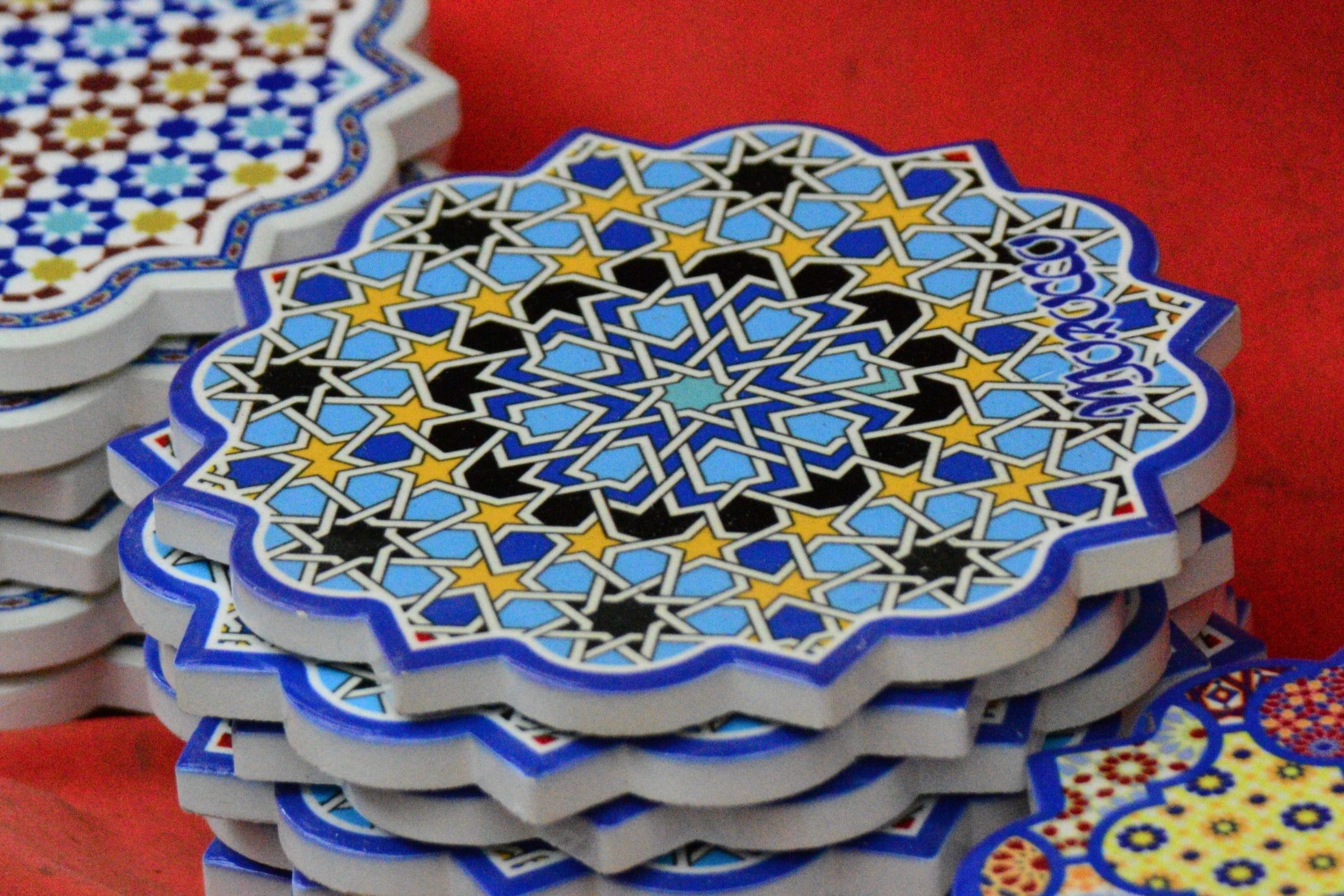 🌀 Nasze podkładki wykonane zostały własnoręcznie przez marokańskich rzemieślników w Fez – mieście słynącym z mistrzowskiej obróbki glazury. Stworzone z autentycznej mozaiki zellige, zachwycają precyzyjnym wzornictwem i bogactwem kolorów. Ich powierzchnia składa się z ręcznie ciętych kafelków, które tworzą geometryczne wzory inspirowane tradycyjną sztuką marokańską.