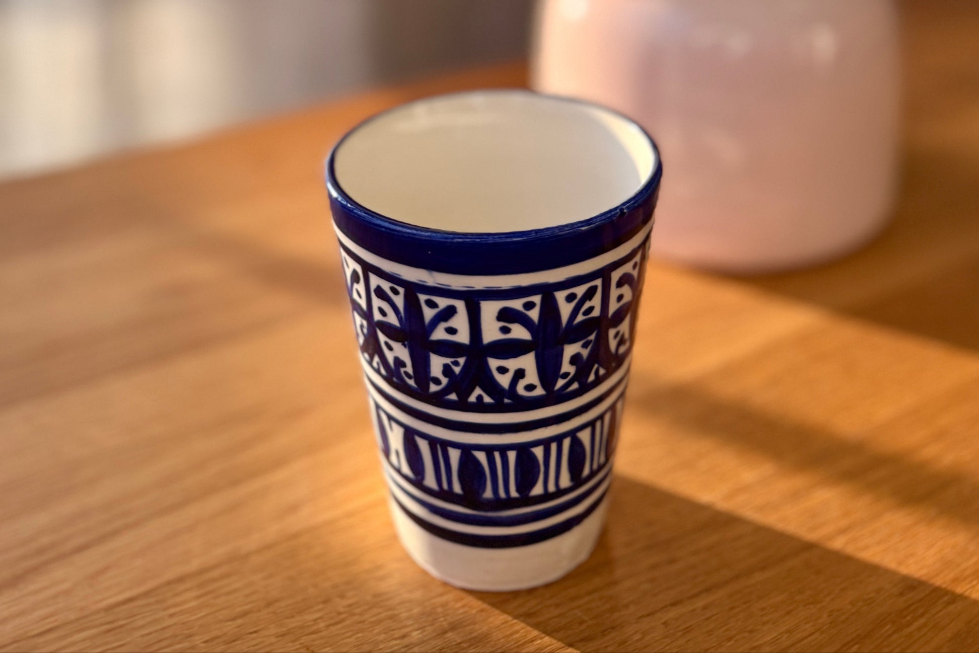Nasze kubki wykonane zostały własnoręcznie przez marokańskich rzemieślników i artystów ceramicznych, którzy od pokoleń tworzą unikalne naczynia metodami przekazywanymi z mistrza na ucznia. Każdy kubek to efekt precyzyjnej pracy i pasji – formowany z naturalnej gliny, ręcznie malowany tradycyjnymi wzorami i wypalany w piecach, aby uzyskać niepowtarzalny charakter i trwałość.