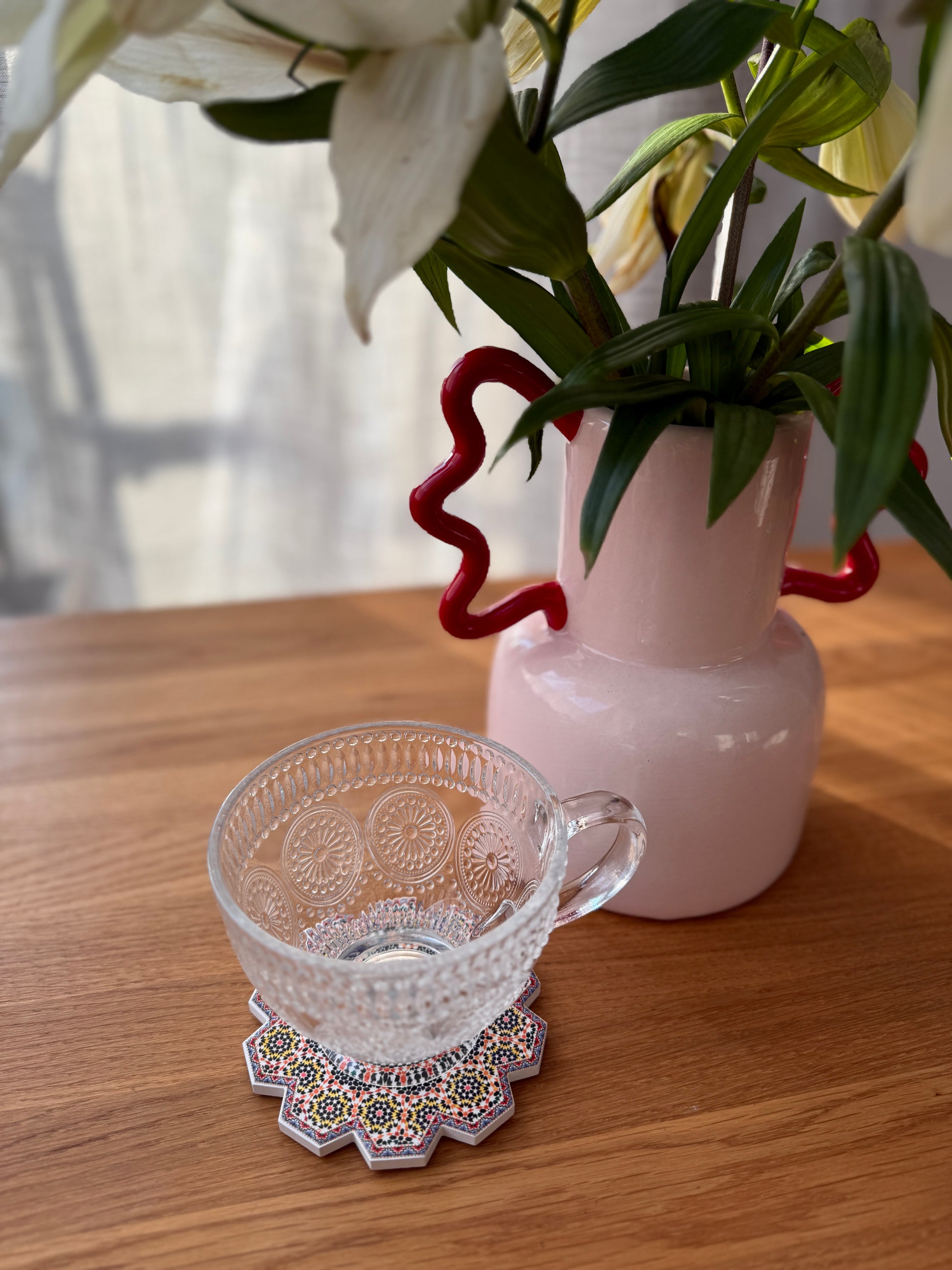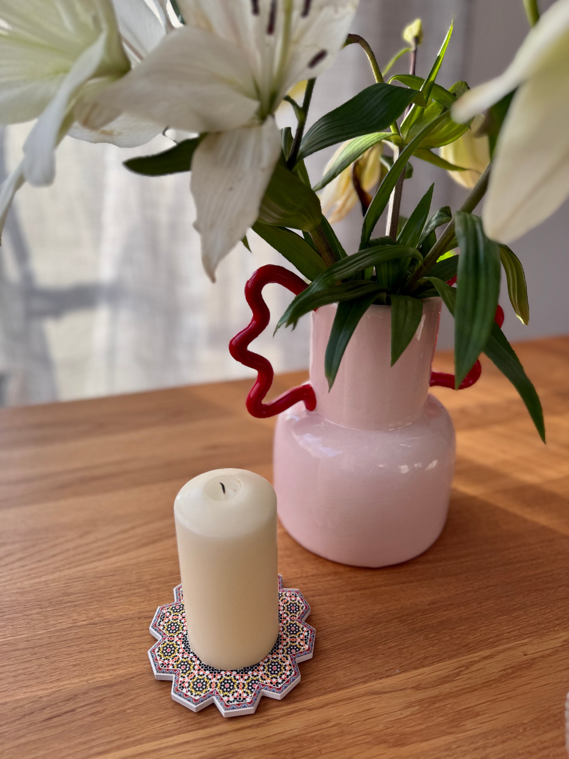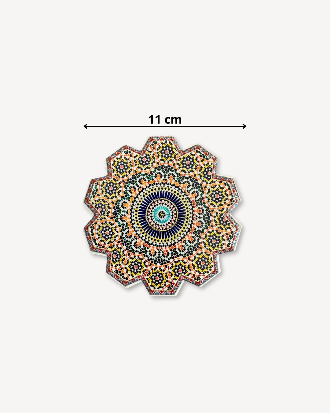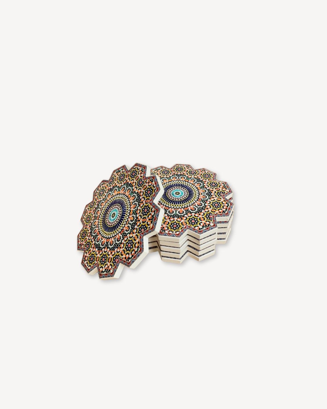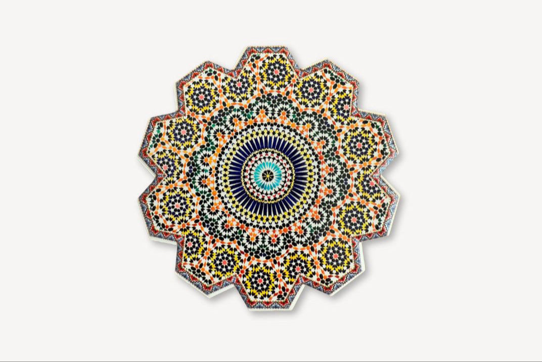 🌀 Nasze podkładki wykonane zostały własnoręcznie przez marokańskich rzemieślników w Fez – mieście słynącym z mistrzowskiej obróbki glazury. Stworzone z autentycznej mozaiki zellige, zachwycają precyzyjnym wzornictwem i bogactwem kolorów. Ich powierzchnia składa się z ręcznie ciętych kafelków, które tworzą geometryczne wzory inspirowane tradycyjną sztuką marokańską.