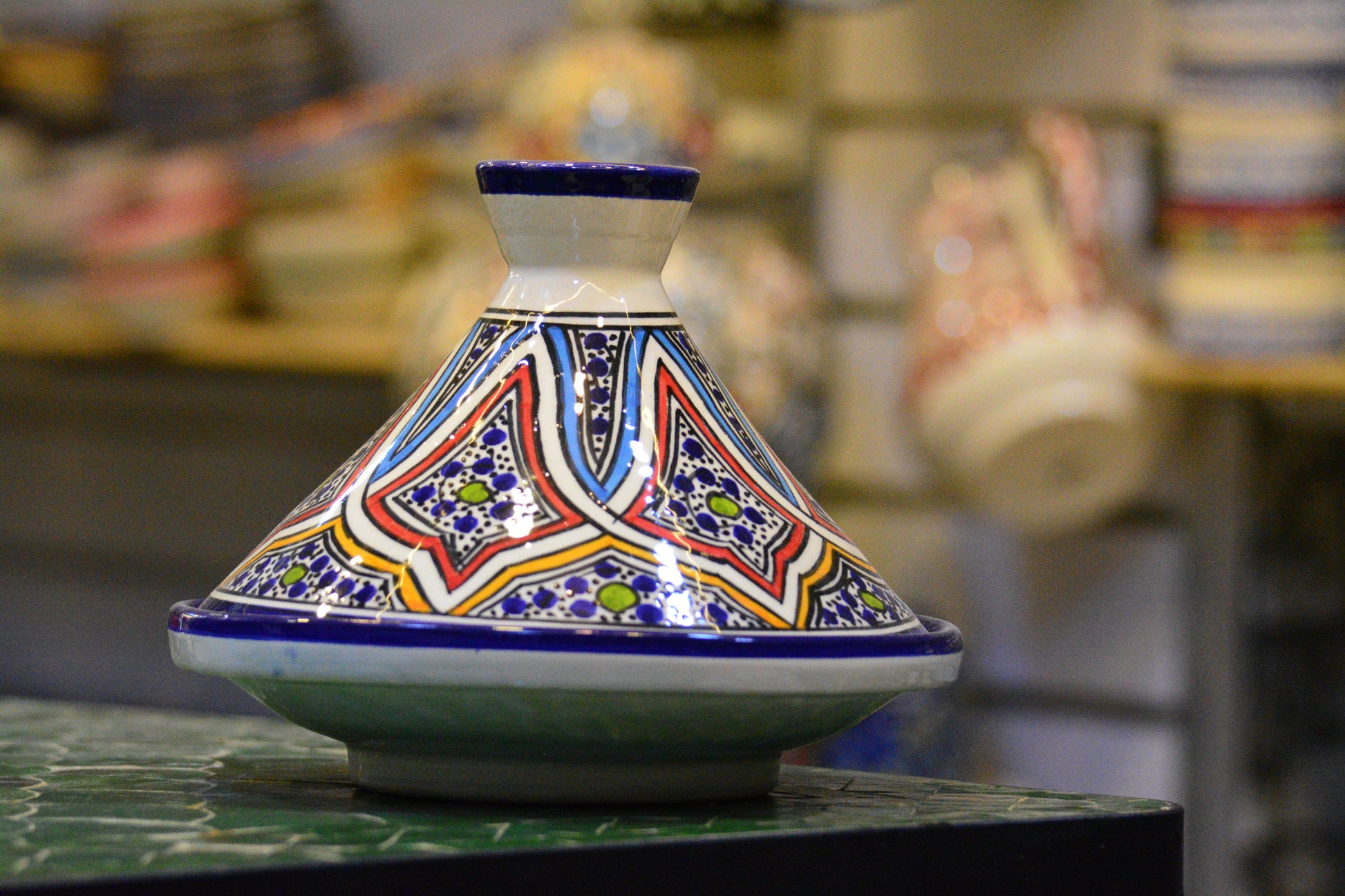 Ręcznie wykonane, tradycyjne marokańskie naczynie wykonane z naturalnej gliny, ręcznie malowane i szkliwione przez lokalnych rzemieślników. Składa się z szerokiej podstawy i stożkowej pokrywki, która zapewnia cyrkulację pary – dzięki temu dania są soczyste i pełne aromatu.